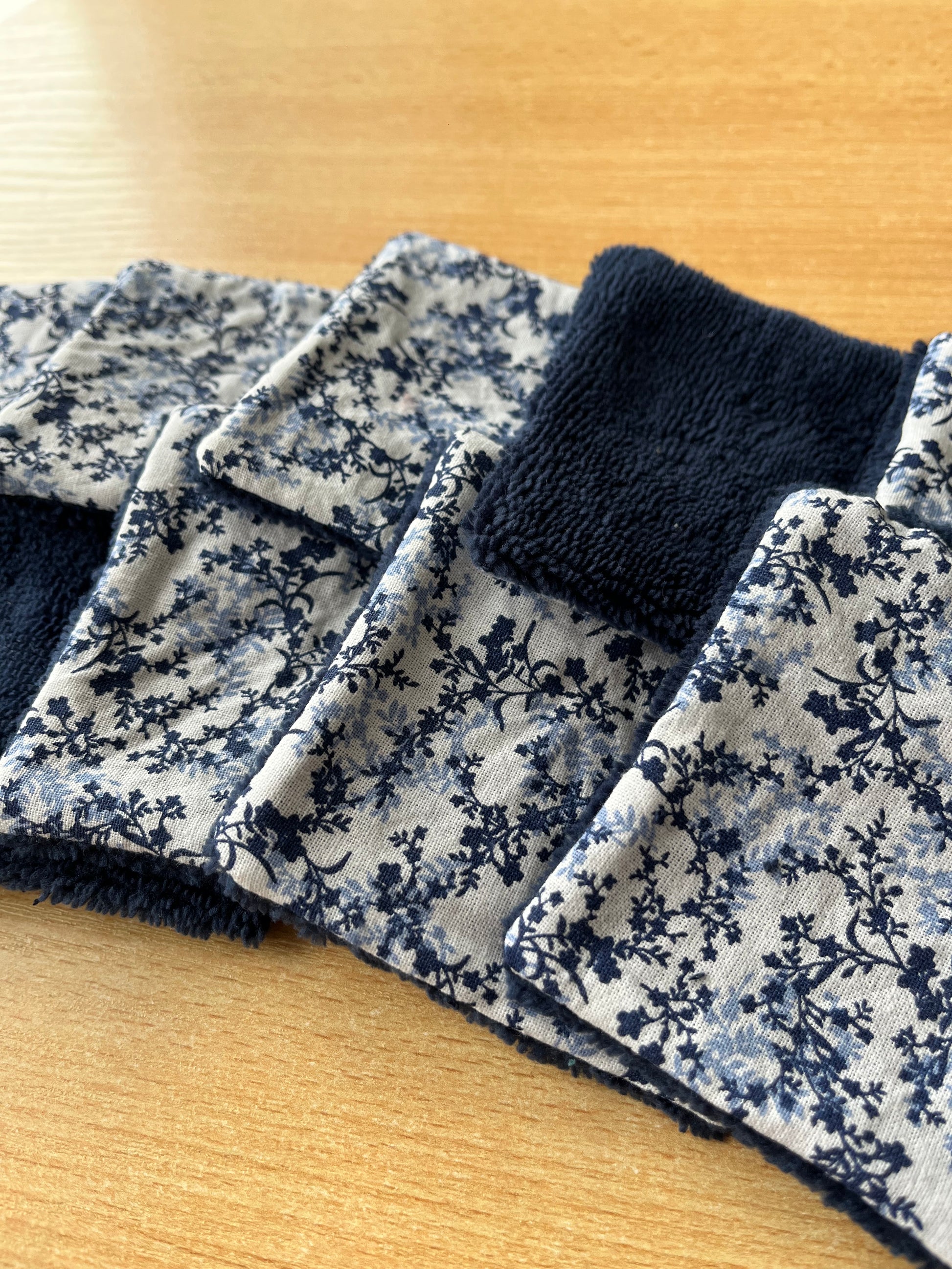 Coton avec une face tissu fleuri et une face bleu nuit.